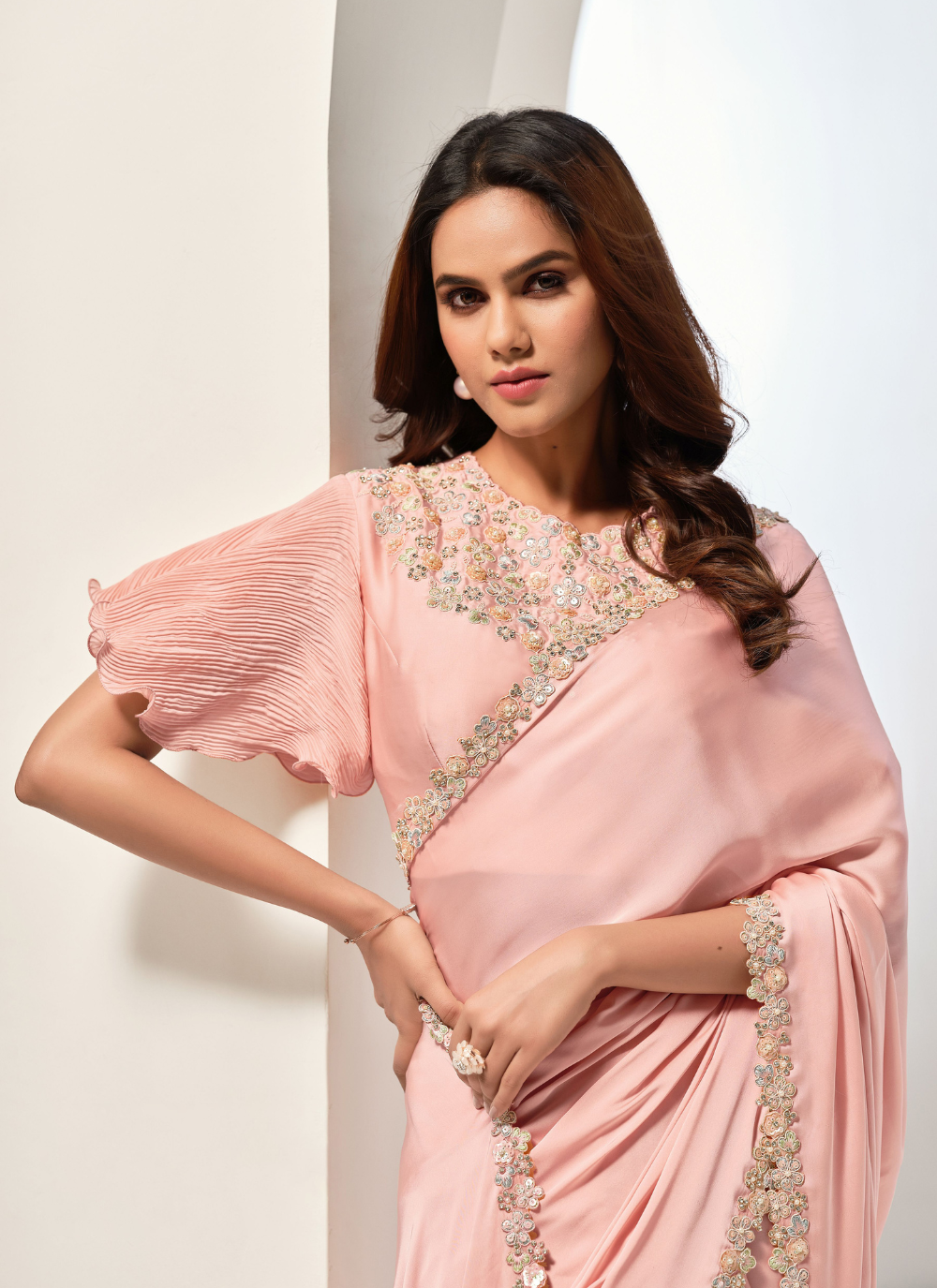 Get ready to turn heads with Nakshatra Peach Silk Saree! The saree's peach color and crepe satin silk fabric adds a touch of elegance, while the sequence and moti work give it a unique and attractive look. Perfect for party wear or any special occasion. (Note: Blouse fabric is also crepe satin silk for maximum style!)