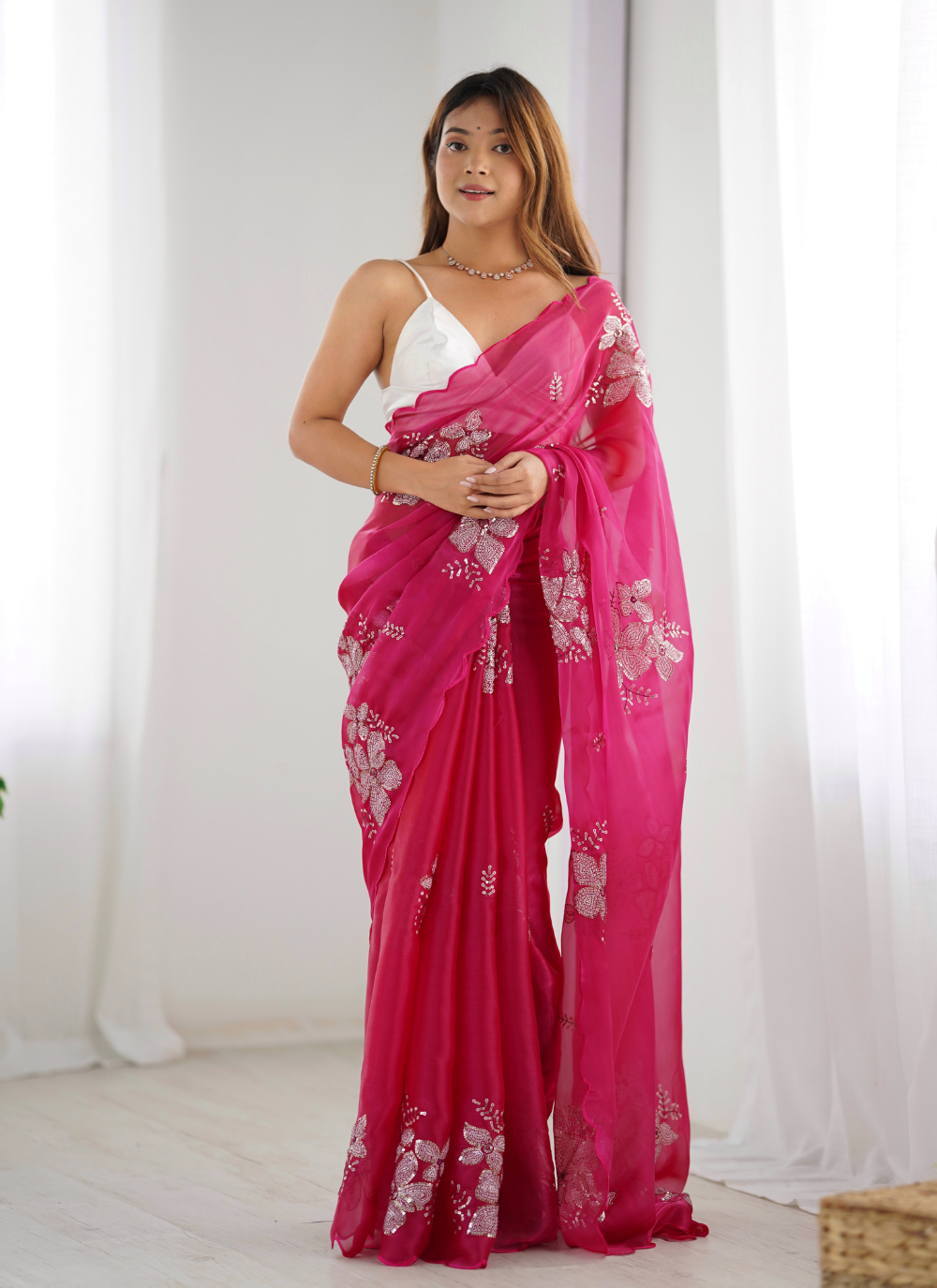 Add a playful touch to your wardrobe with the Nakshatra Pink Embroidered Saree. Made from luxurious silk fabric, this saree features designer sequin embroidery that adds a touch of glam and makes a statement. Perfect for a girls' night out, casual evening, or temple wear, this saree will have you shining wherever you go! Note: Color may slightly be different from the actual item due to photographic lighting sources or the monitor's settings.