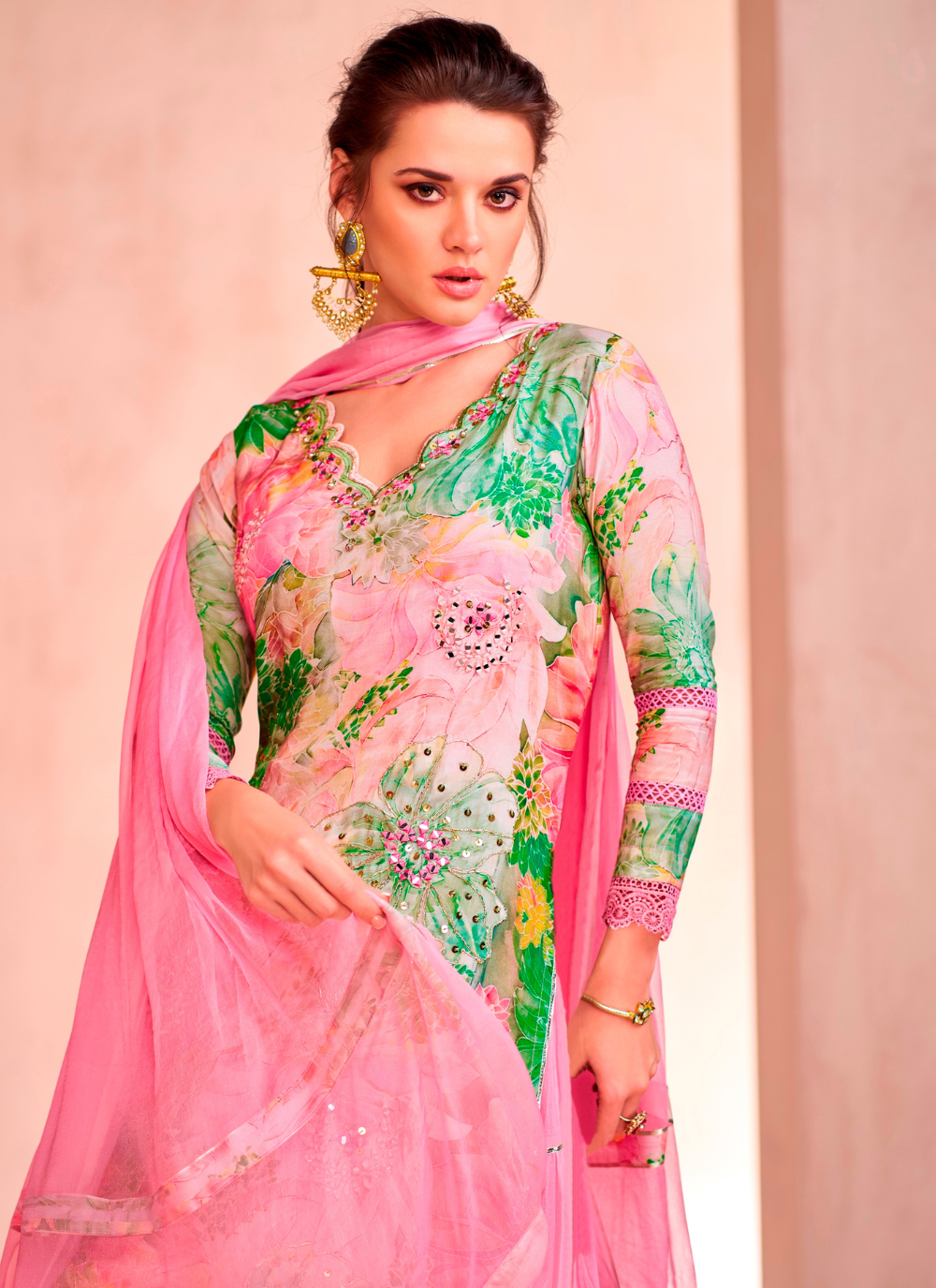 Get ready to turn heads with the Nakshatra Pink Floral Skirt Styled Suit! The beautifully digitally printed kameez is adorned with intricate hand and embroidery work, as well as stunning stones. With added lace work on the sleeves and bottom, this outfit is perfect for any occasion - from evenings out to poojas and girls nights. The mulslin fabric and gotta work on the skirt adds an extra touch of elegance, while the najmin fabric dupatta completes the designer look. Don't miss out on this one-of-a-kind outfit! Note: Color may slightly be different from the actual item due to photographic lighting sources or the monitor's settings.