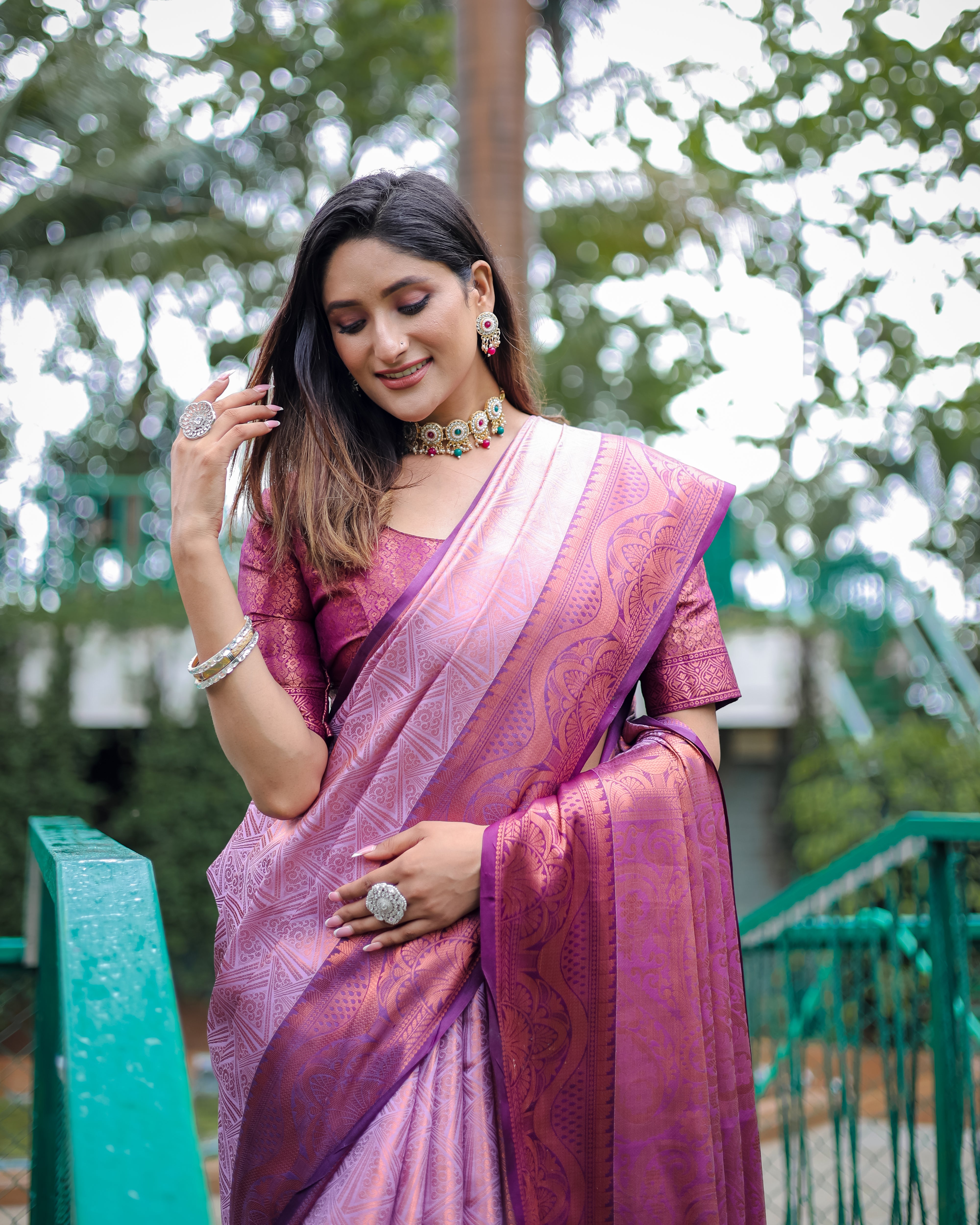Get ready to turn heads with our Nakshatra Lavender Kanjivaram silk saree! This elegant saree features a beautiful Lavender color that will bring out your natural glow, along with a contrasting purple blouse. Made from luxurious Kanjivaram silk, it boasts stunning copper zari work that adds a touch of traditional charm. Perfect for any occasion, this saree is sure to make you stand out in a classy and sophisticated way.