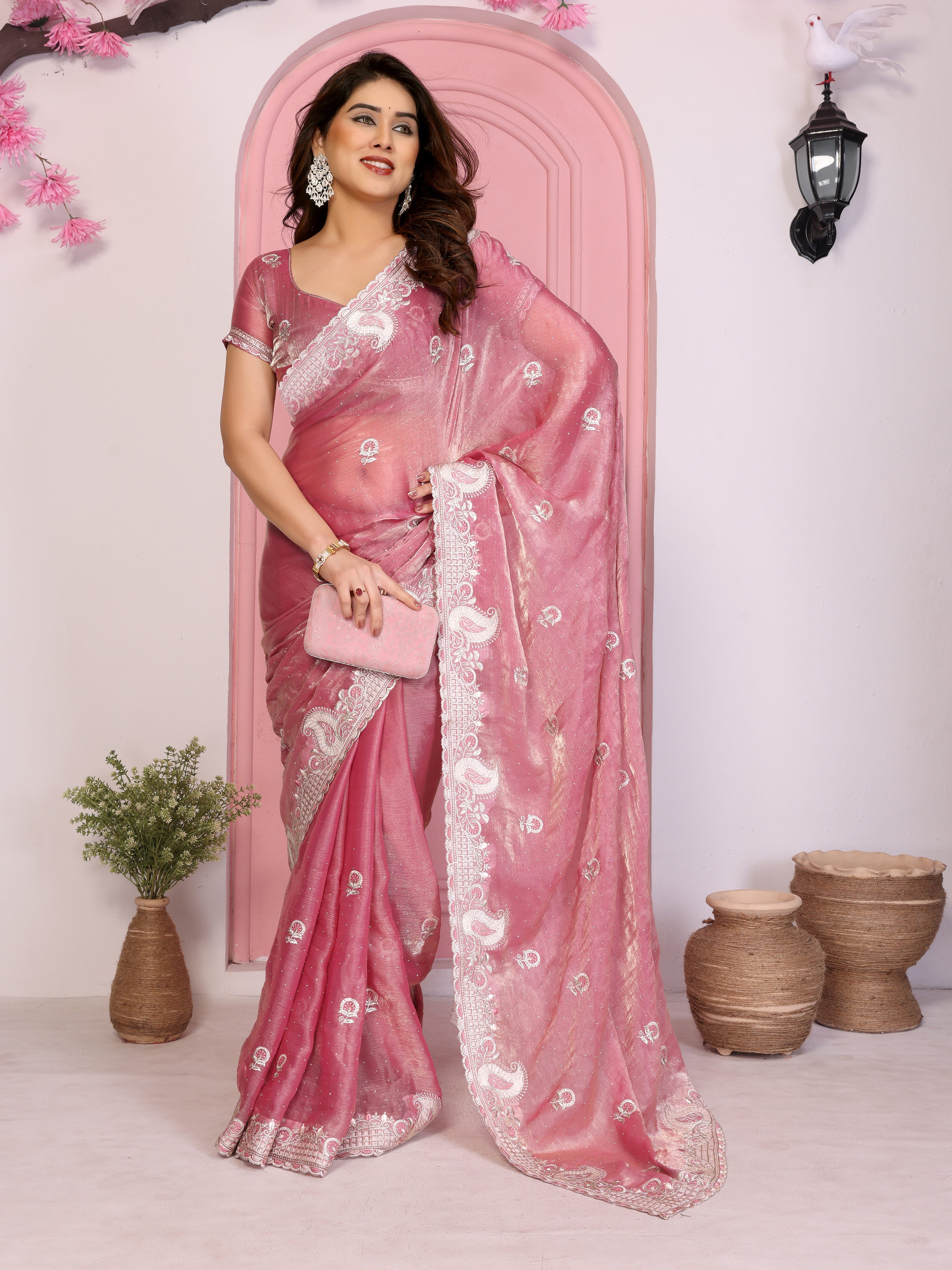 Embrace elegance with the Nakshatra Pink Printed Bollywood Style Saree, featuring a beautiful designer border that runs throughout the saree and the blouse sleeves. Adorned with delicate embroidery and sparkling Swarovski work, this lightweight saree is your perfect pick for kitty parties, birthday celebrations, get-togethers, or any festive pooja. Add a touch of glam and fun to your wardrobe with this stunning ensemble. Note: Color may slightly be different from the actual item due to photographic lighting sources or the monitor's settings.