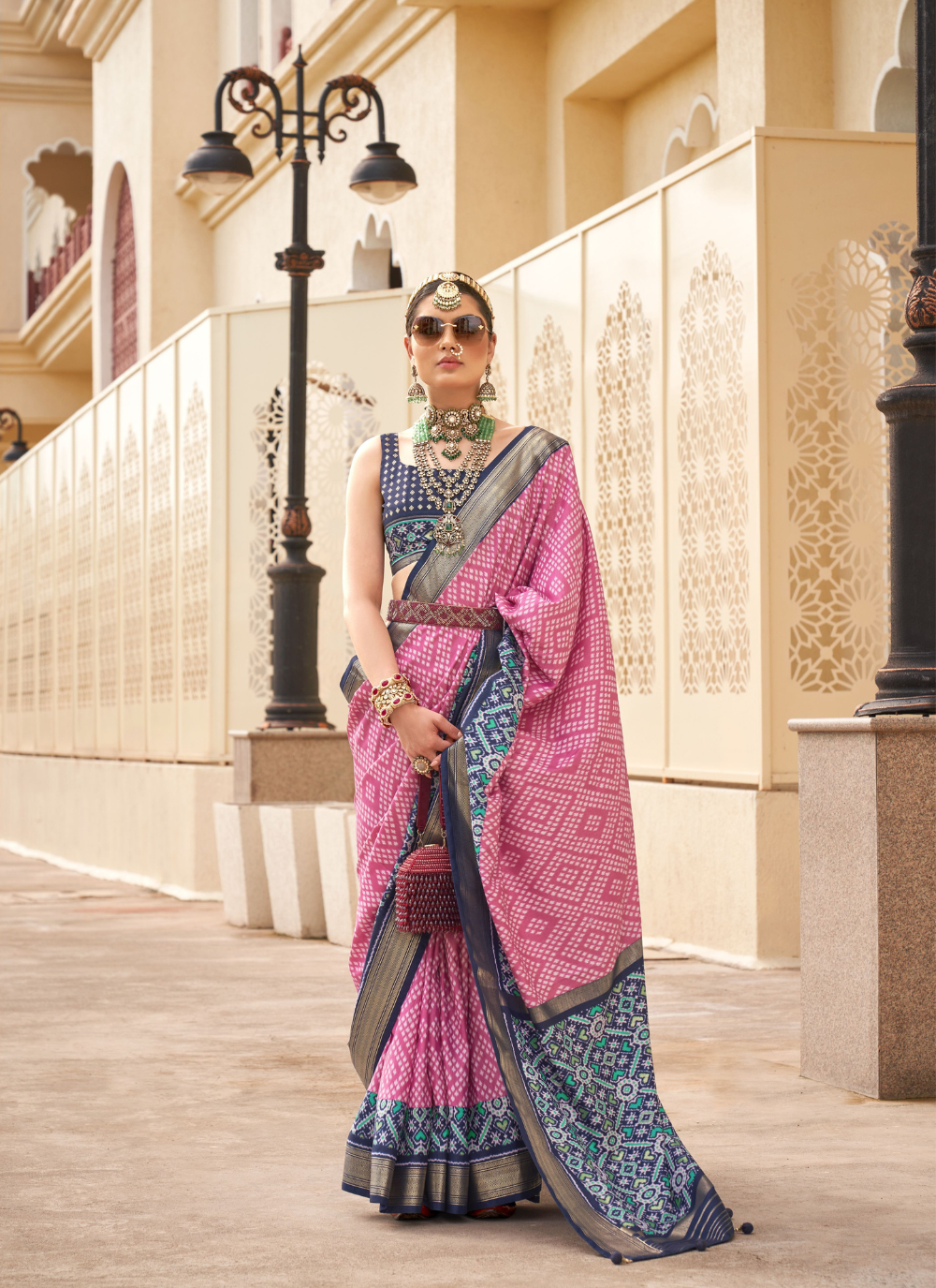 Elevate your style with the Nakshatra Pink Soft Patola Silk Saree. This elegant saree is perfect for weddings, festivals, and any occasion that calls for a touch of sophistication. Made with love, its unique print and tassel detail are sure to turn heads. Pair with heels or flats for a graceful and eye-catching look. Note: Color may slightly be different from the actual item due to photographic lighting sources or the monitor's settings.
