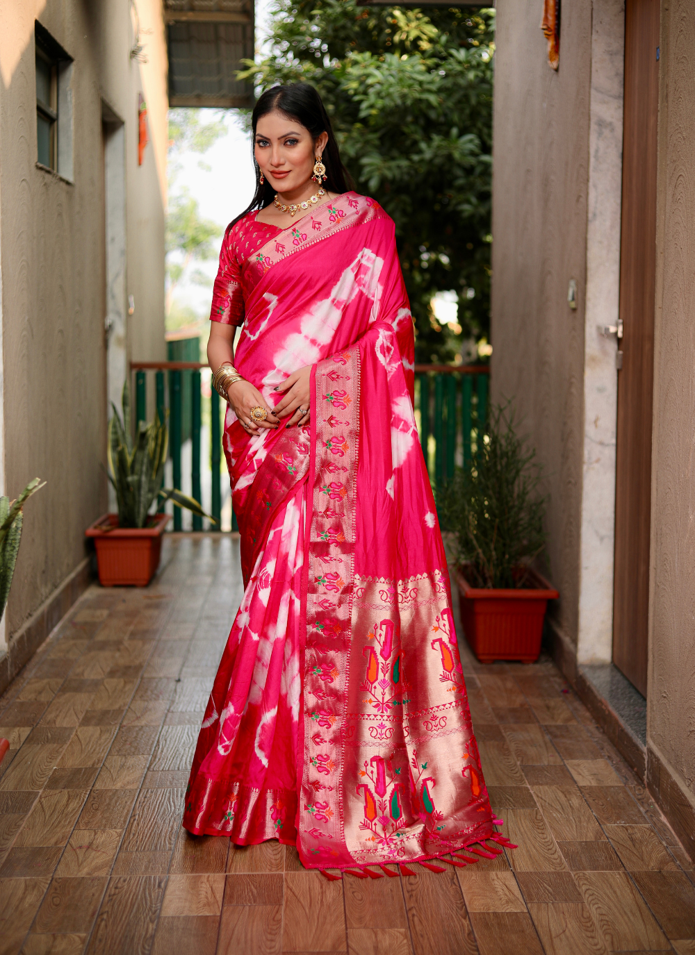 Get ready to make a statement with the Nakshatra Pink Tie and Dye Paithani Silk Saree. The stunning paithani silk fabric with shibori print is accented by heavy zari weaving on the pallu and border. The accompanying silk blouse with butti work adds a touch of elegance. Perfect for weddings, parties, and ceremonies. Note: Color may slightly be different from the actual item due to photographic lighting sources or the monitor's settings.