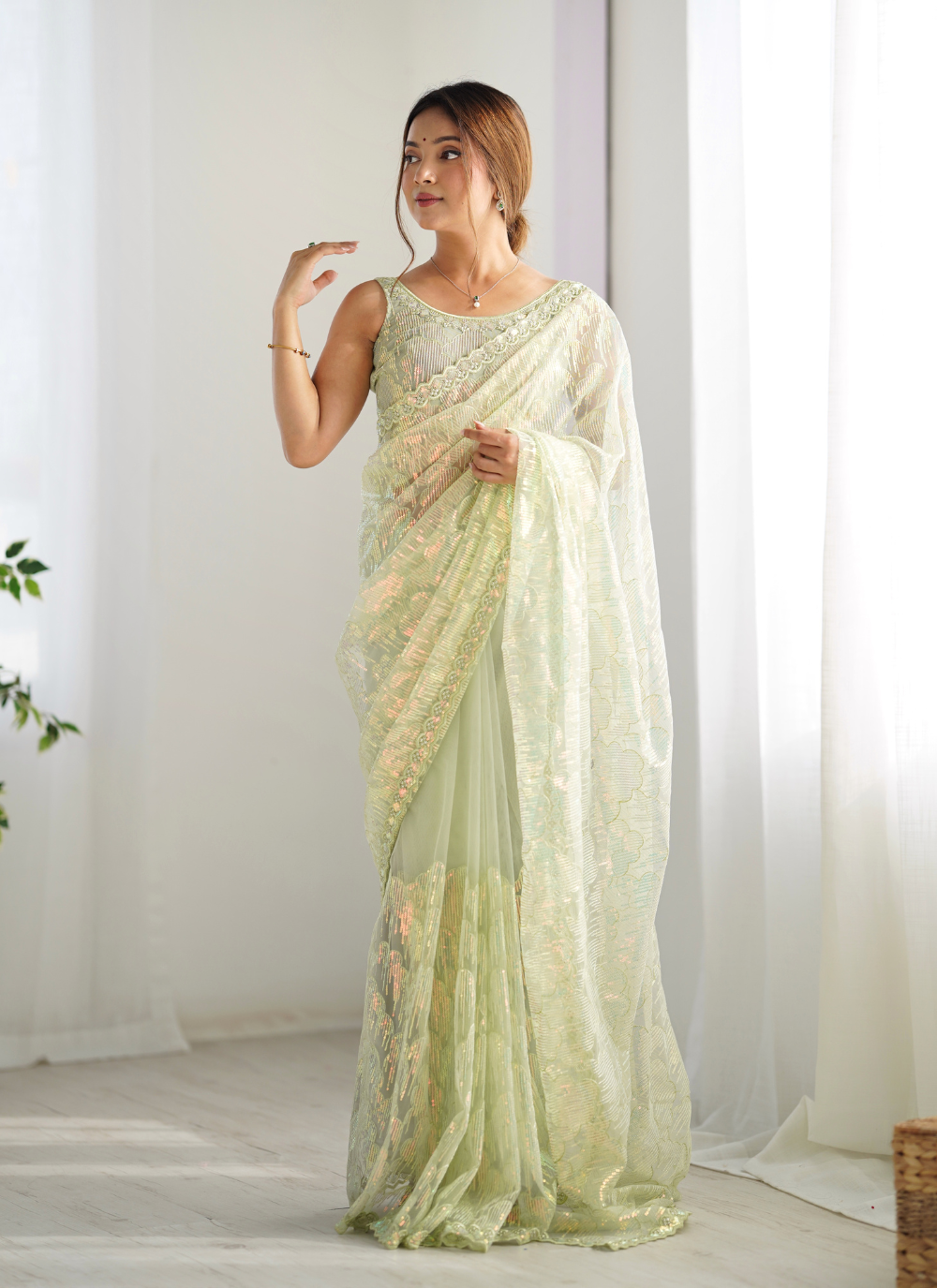 Elevate your saree game with the Nakshatra Cream Embellished Net Saree. Made of Mono Net fabric, this designer saree features stunning sequence embroidery work all over with a mesmerizing HOLOGRAPHIC effect. Perfect for parties, this saree is guaranteed to make you stand out! Note: Color may slightly be different from the actual item due