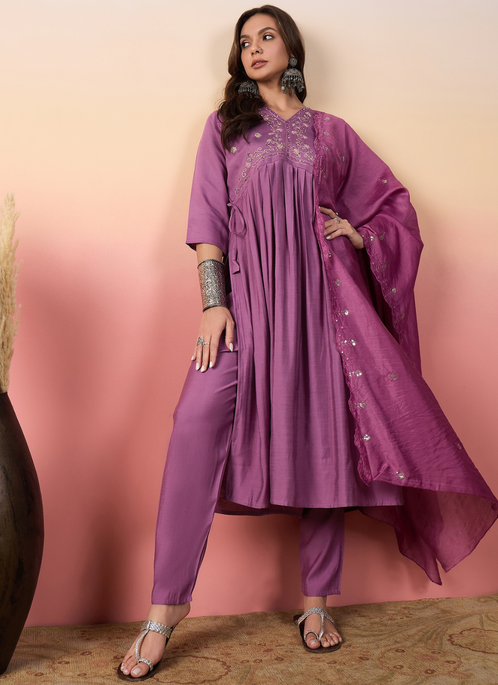 Introducing our Nakshatra Purple Colored Silk Embroided Suit - a stunning and luxurious addition to your wardrobe. Elevate your style with designer embroidery work, playful mustard accents, and the unique touch of silk. Don't be afraid to stand out with this quirky and fun piece! 🌟Note: Color may slightly be different from the actual item due to photographic lighting sources or the monitor's settings.