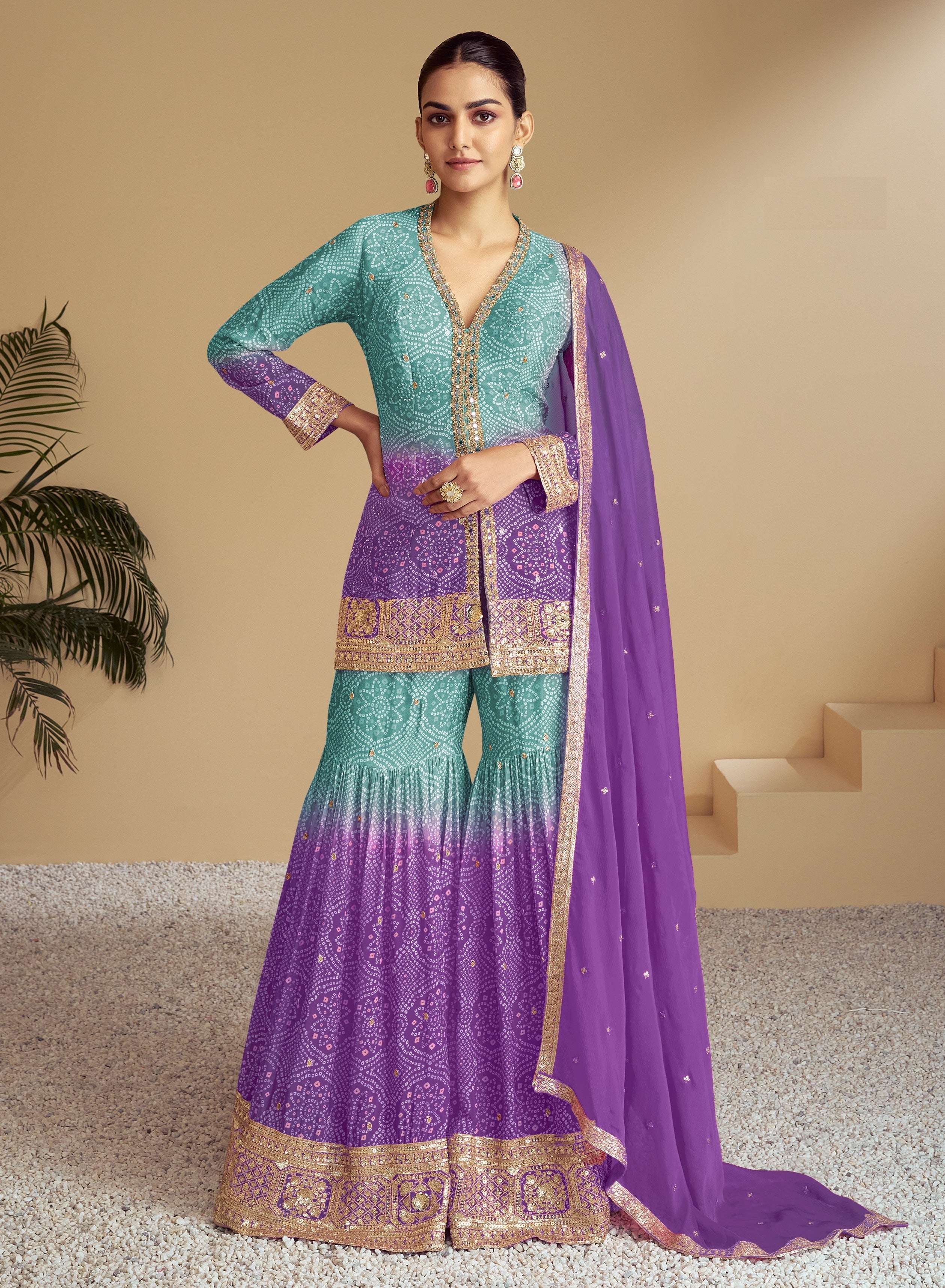 Be the star of any party or wedding with our Nakshatra Purple Garara Suit! Made of Chinon fabric, this dual-colored suit features a beautiful bandhini print and is adorned with zari, sequence, and embroidery work. Complete with an elegant laced dupatta, this suit is perfect for mehendi nights, sangeet nights, or any special occasion. Attractive and stylish, this designer salwar suit will make heads turn. Note: Color may slightly be different from the actual item due to photographic lighting sources or the monitor's settings.