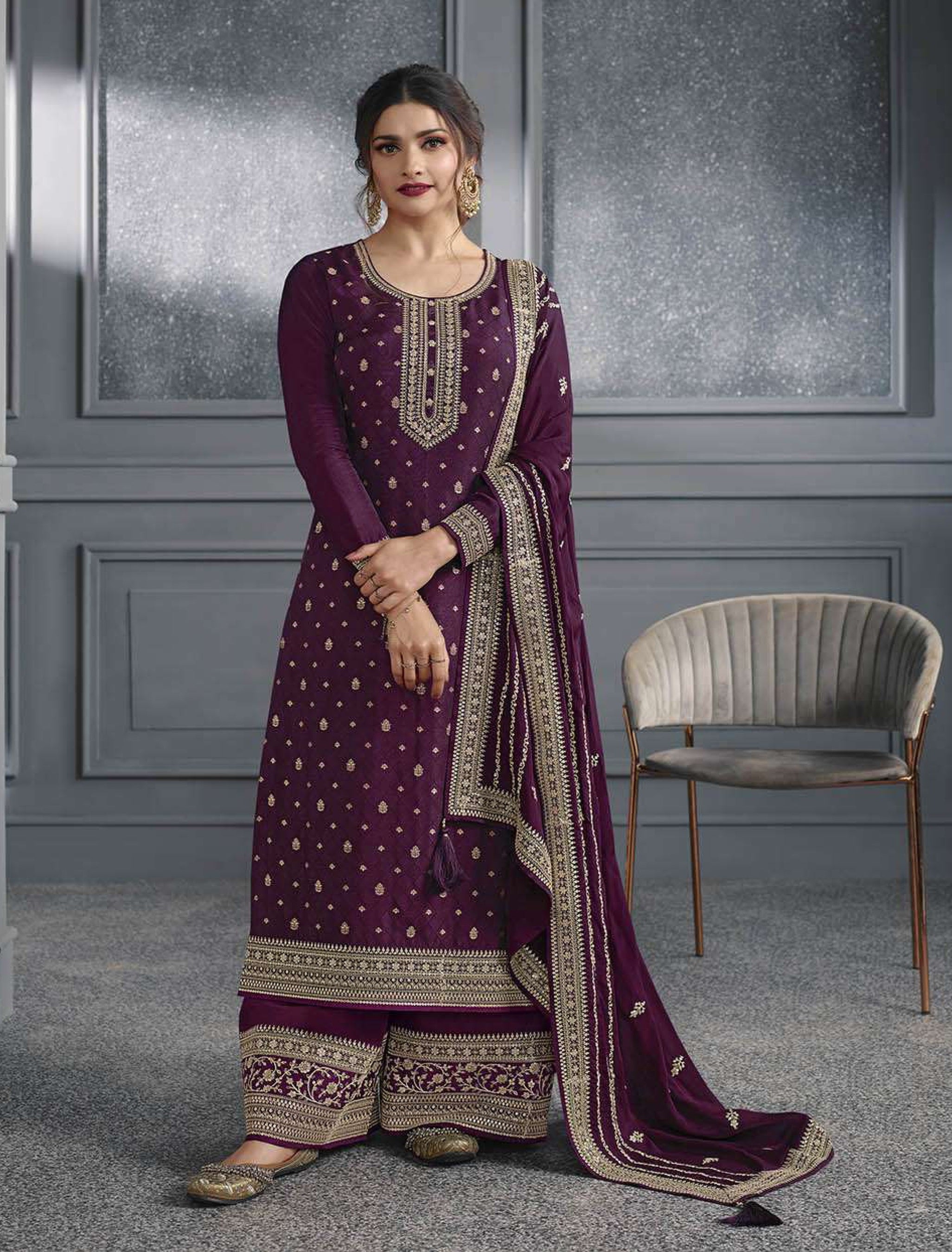 Get ready to stand out in this Nakshatra Purple Party wear Salwar Suit! Made with luxurious dola silk, it features stunning zari embroidery, sequence work, and diamond accents. Perfect for parties and ceremonies, this designer suit will have you looking and feeling fabulous. 💜🎉