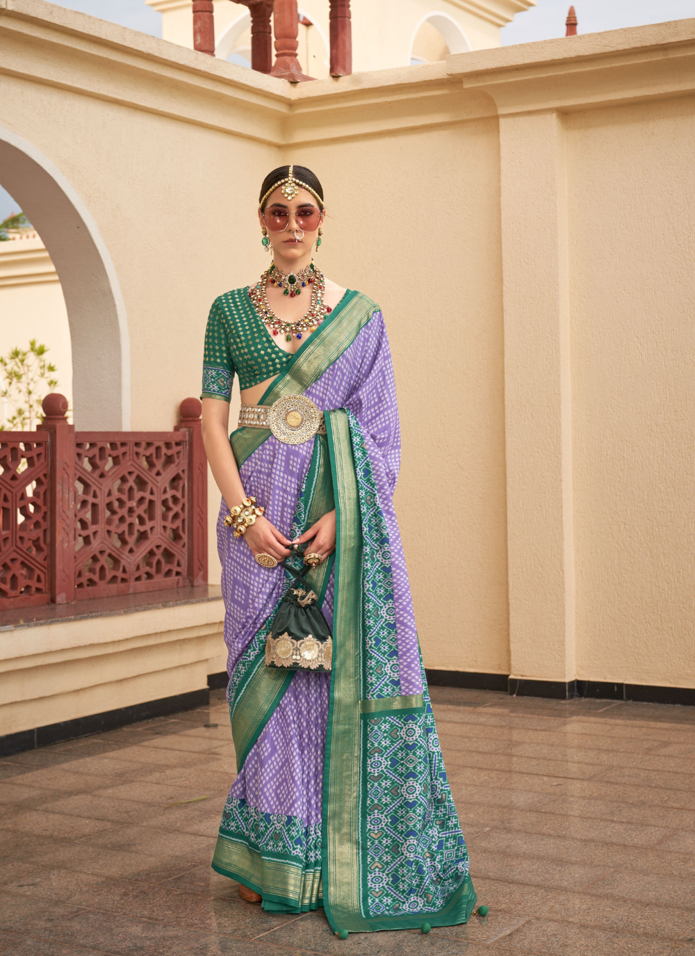 Introducing the Nakshatra Purple Soft Patola Silk Saree - a stunning addition to any wardrobe. Made with love, this saree flaunts your style and adds a touch of elegance to any occasion. With its intricate prints and tassels, it's sure to turn heads. Pair it with heels or flats for a graceful look. Perfect for weddings and festivals. Note: Color may slightly be different from the actual item due to photographic lighting sources or the monitor's settings.