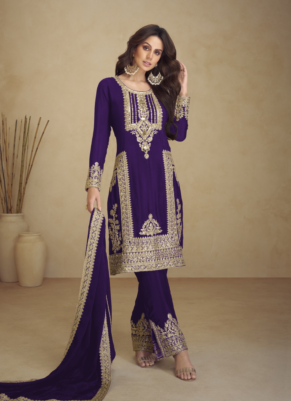 Get ready to be the talk of the party with our Nakshatra Purple Stylish Party wear Suit. Made from georgette fabric, it features heavy designer embroidery on the neck, sides, and sleeves of the kameez, along with the bottom of the pant. The perfect choice for festivals and ceremonies, this suit also adds a touch of elegance with its sequence work. Be the stylish star of any event with this suit! Note: Color may slightly be different from the actual item due to photographic lighting sources or the monitor's settings.