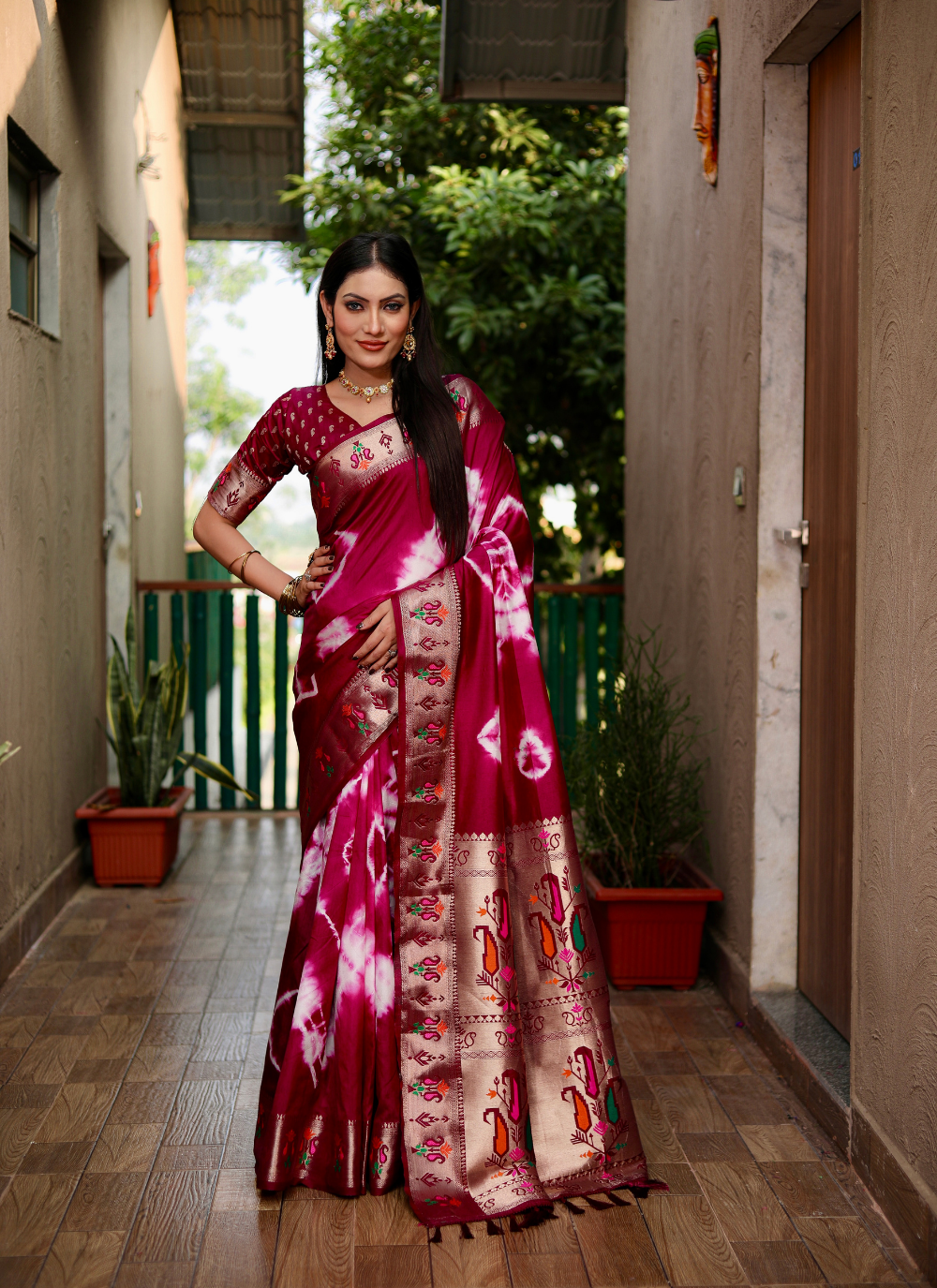 Add a pop of color and style to any occasion with the Nakshatra Purple Tie and Dye Paithani Silk saree. Made with luxurious paithani silk fabric and adorned with shibori print, zari weaved saree, and a beautiful heavy zari weaved pallu, this saree will make heads turn. Complete the look with the heavy border and silk blouse with butti work. Perfect for weddings, parties, and ceremonies. Note: Color may slightly be different from the actual item due to photographic lighting sources or the monitor's settings.