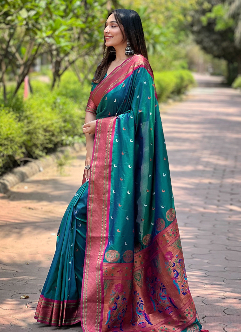 Indulge in luxury with our Nakshatra Rama Paithini Silk saree. Handwoven with fine fabric and adorned with intricate paithini meenakari work and copper zari, this saree features elegant small motifs all over and a heavy weaved pallu. Elevate your style with this exclusive piece.