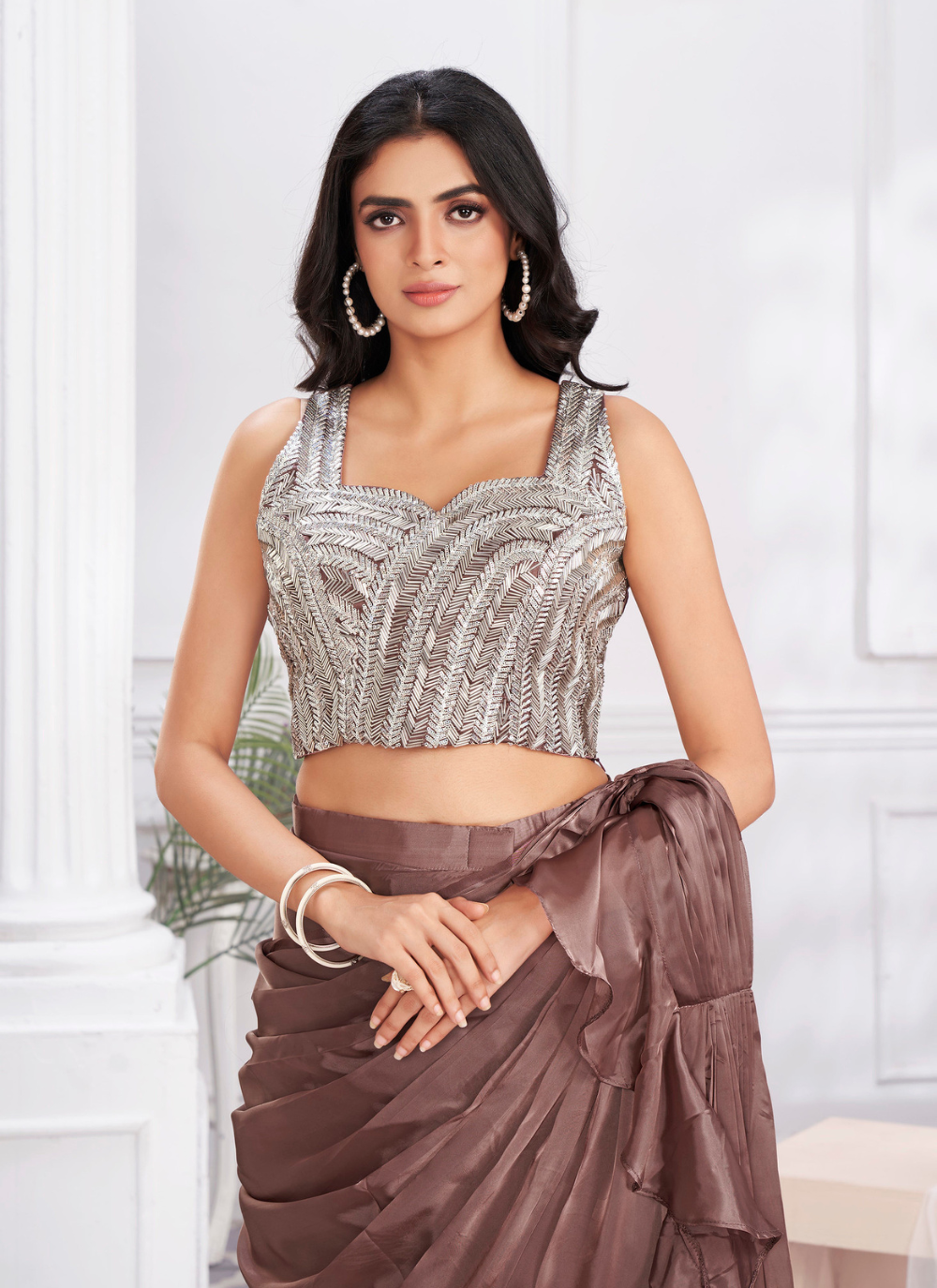 Get ready to turn heads with the Nakshatra Ready to wear Satin sari! Made from luxurious satin silk in a rich coffee color, this sari features a heavily embroided blouse and hand work for a touch of elegance. With a fully stitched size 38 (with margins) and a fancy drape, this sari is perfect for any girlish occasion - from parties and kitty nights to girls' night out and special events.