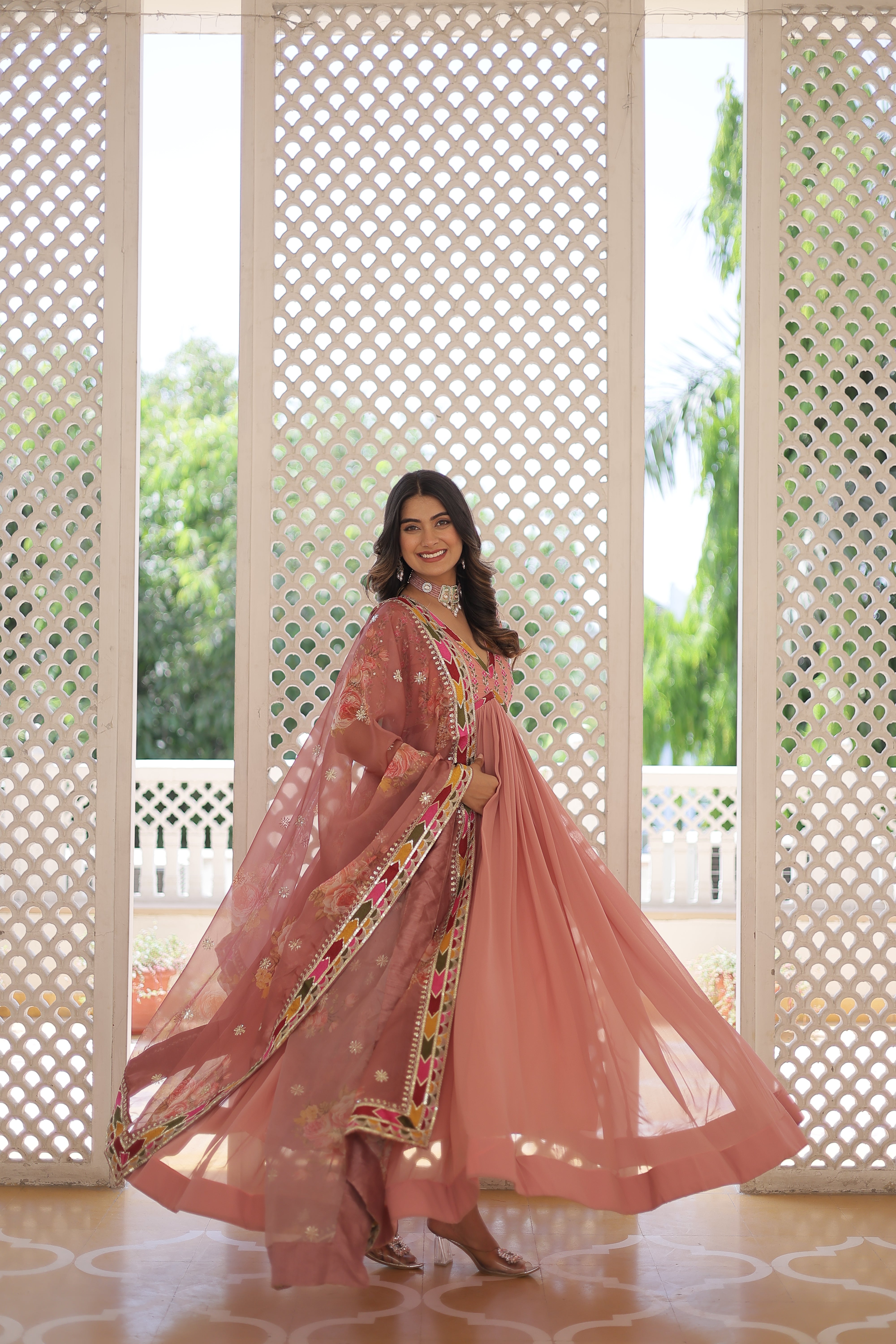 Add a dash of girlish charm to your party look with Nakshatra Readymade gown. Made of faux georgette, it features intricate zari, sequence, and designer thread embroidery in multi colors. Paired with a Russian silk dupatta and a lovely border & lace, this gown is perfect for the stylish and playful you!