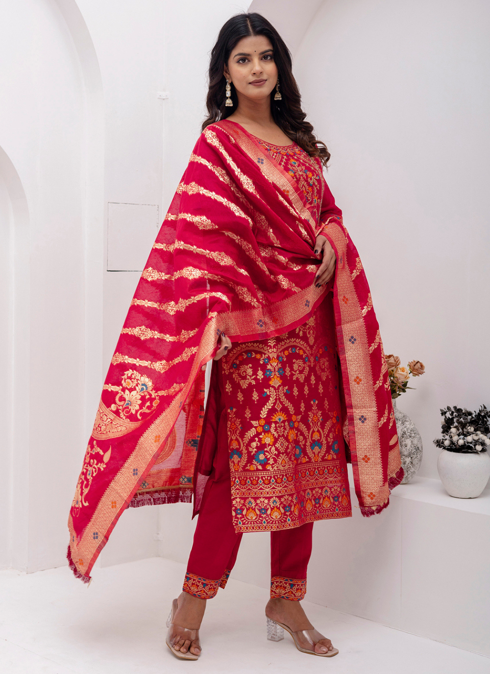 Transform into royalty with the Nakshatra Readymade Red Silk Suit. Its black jacquard weave and intricate handwork add an elegant touch to this designer suit. Perfect for adding grace and charm to your personality, this suit comes with a matching dupatta made of high-quality jacquard silk. Elevate your style with this exquisite suit! Note: Color may slightly be different from the actual item due to photographic lighting sources or the monitor's settings.
