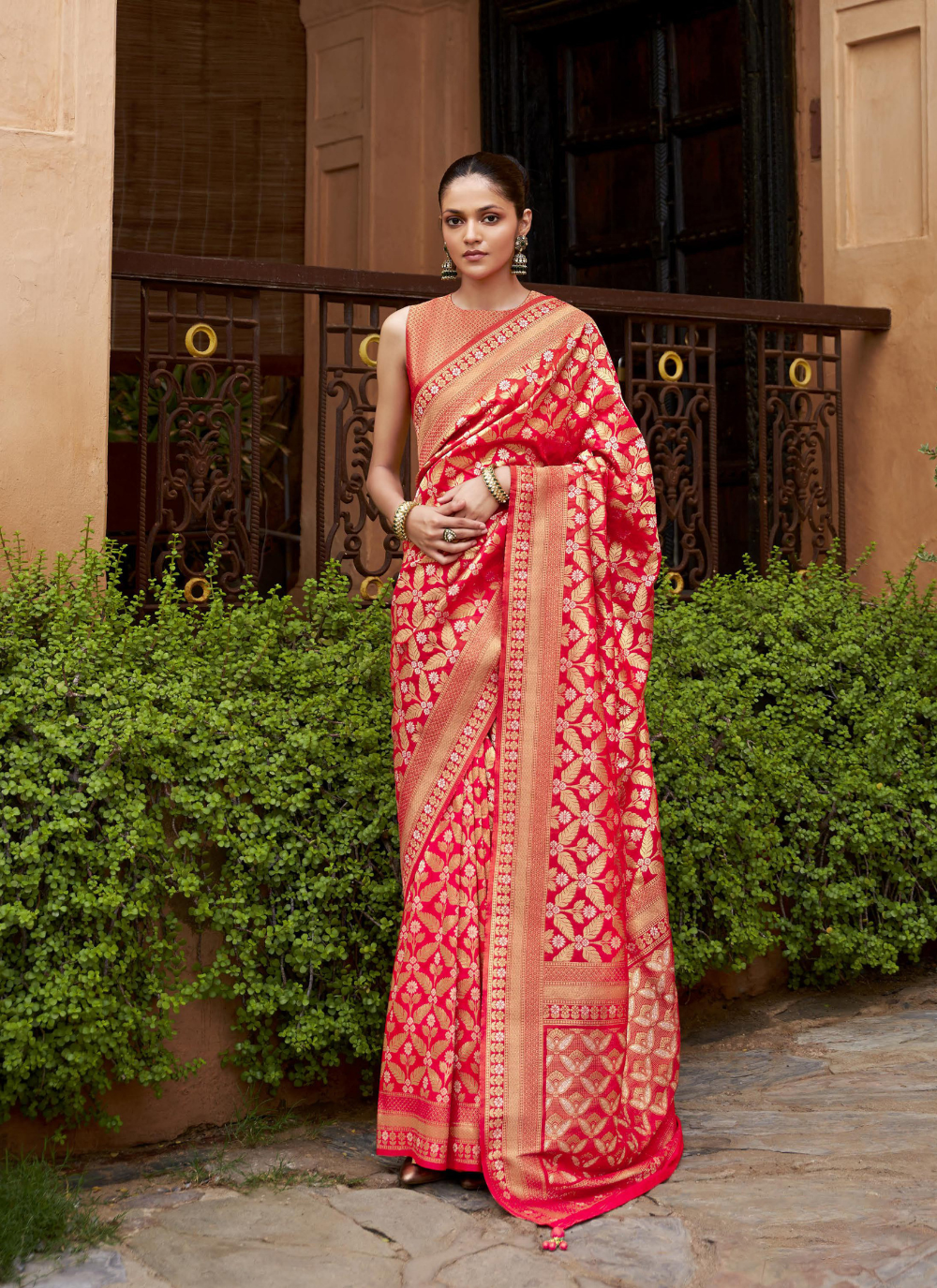 Get ready to turn heads at your next event with the Nakshatra Red Brocade Silk Saree! Made with luxurious viscose silk fabric, this saree features beautiful zari butta work in gold and silver, adding a touch of elegance to its already stunning design. Perfect for weddings, parties, and even temple wear, this saree is a must-have for any traditional wardrobe. And with its evergreen design, you'll be reaching for it time and time again. Don't miss out on this party wear saree in fine colored Viscose Silk - grab yours now!