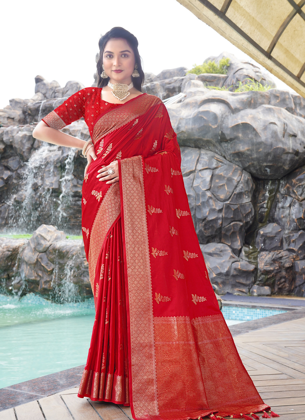Indulge in the sophistication of the Nakshatra Red satin silk saree. The intricate weaving on the pallu and ornate border evoke a sense of regality and culture. Adorned with stunning motifs and zari designs, this saree exudes elegance, making it ideal for festivities and gatherings. Complete the ultimate look with the Jaquard blouse.