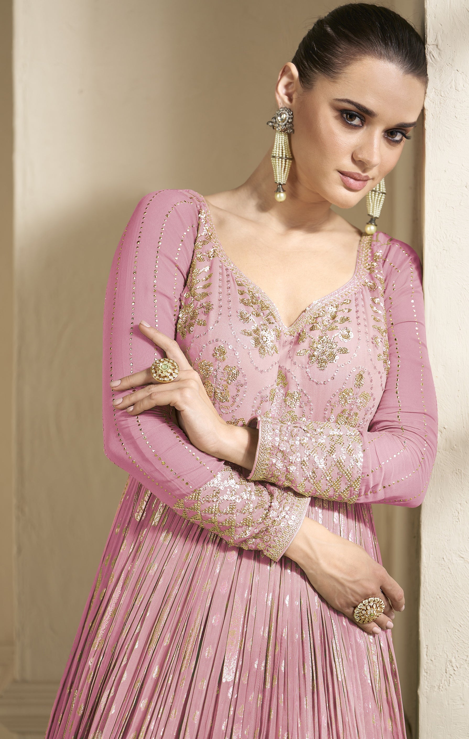 Elevate your style game with this Nakshatra Rose Pink Georgette Anarkali suit. The stunning pastel pink color, designer embroidery, and delicate sequin work make it the epitome of grace. Made with georgette fabric, it comes with a santoon bottom and net dupatta for an elegant touch. Get ready to turn heads!