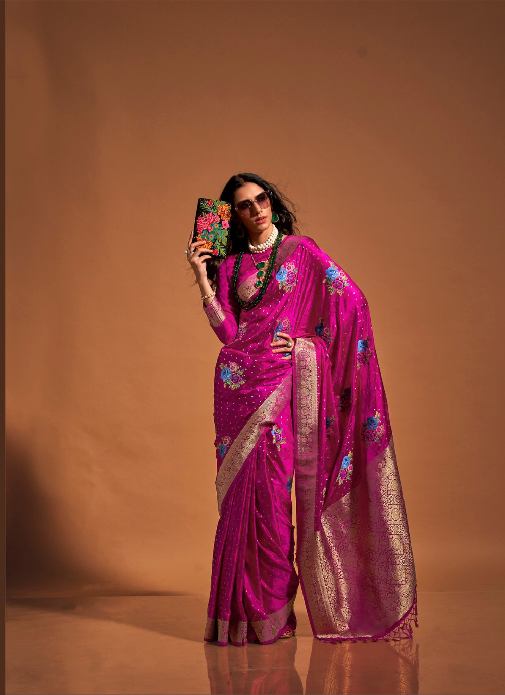 Flaunt luxury with Nakshatra's pure satin handloom rose pink silk saree! Its multicolored flower weaving work adds a touch of elegance, perfect for all seasons and occasions. Get ready to turn heads with this luxurious designer saree! πΊπ§Άπ