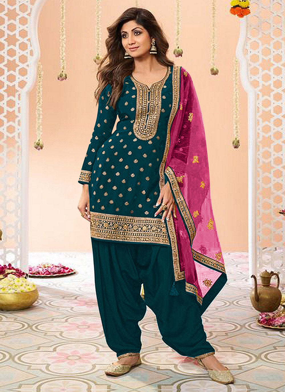 Get ready to rock the dhol with this Nakshatra Shilpa Shetty Blue Silk Suit! Made from luxurious viscose jaquard silk, this suit comes with a designer contrasting embroidered dupatta in net. The yoke and sleeves feature beautiful embroidery, giving you a desi Punjabi look. Complete the look with the semi patiyala pants and you're ready to dance!