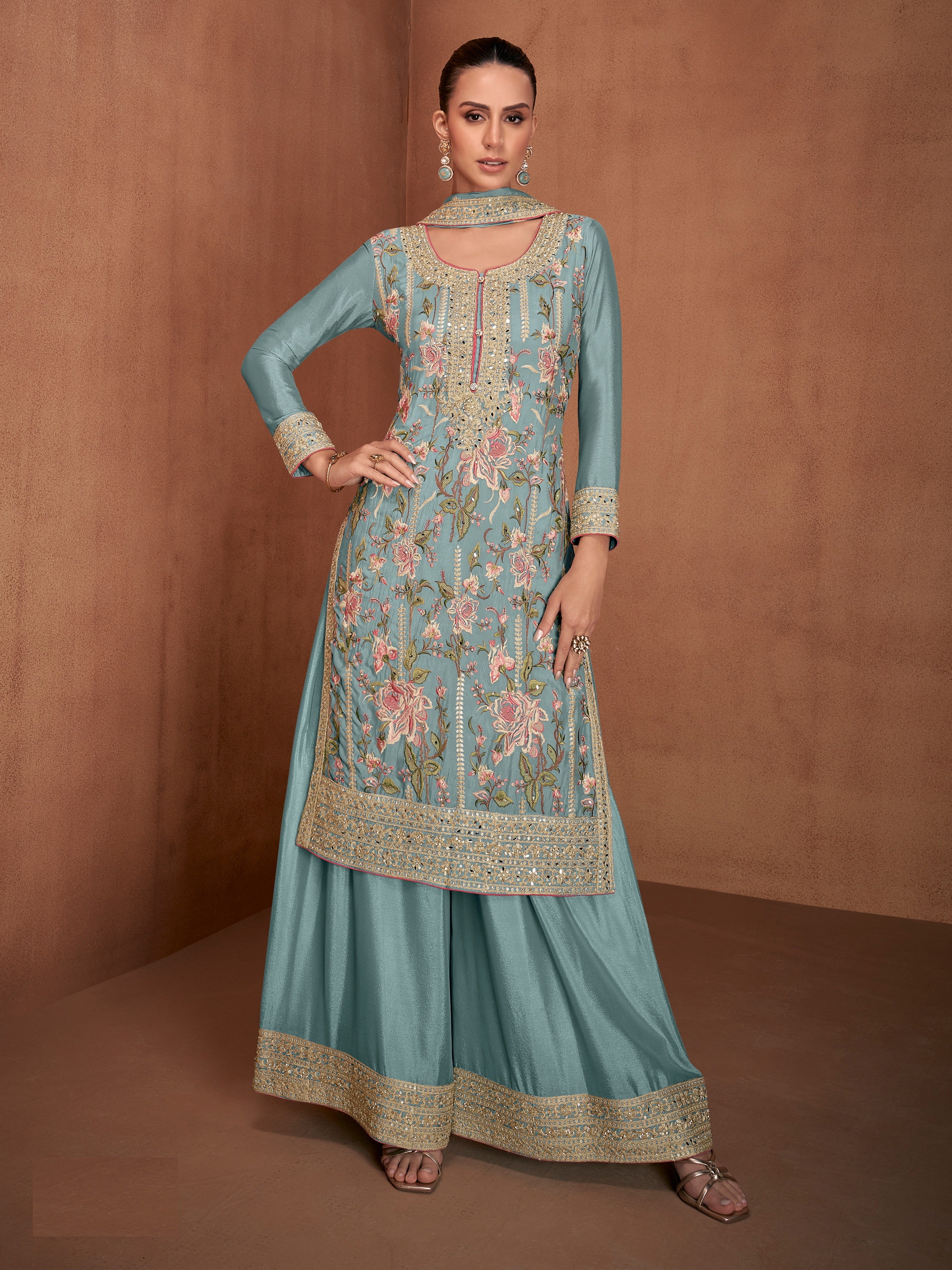 Celebrate in style with the Nakshatra Sky Blue Heavy Embroided Festive Wear! This chic palazzo suit combines traditional florals with modern chinnon silk material and intricate embroidery. The flared gharara palazzo and embellished dupatta add luxurious details, making it perfect for any festive occasion. Don't miss out on this unique and elegant look!