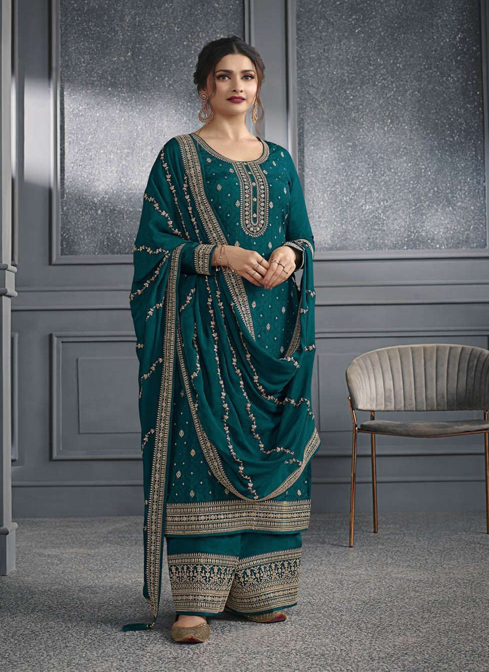 Get ready to slay with the Nakshatra Teal Green Party wear Salwar Suit! Made with dola silk and featuring exquisite zari embroidery, sequence work, and diamond work, this designer suit is the perfect choice for parties and ceremonies. It comes in a vibrant Tale Green color, making you stand out in the crowd.