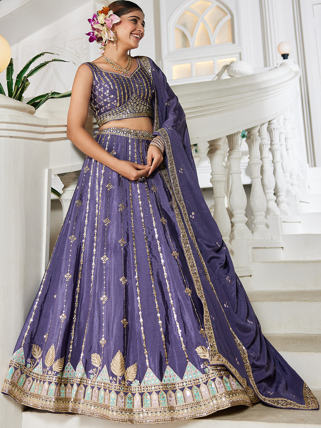 Celebrate every moment in lively style with the Nakshatra Voilet Georgette Lehenga Choli. This playful party outfit dazzles with delicate cording thread and shimmering sequin embroidery, adding sparkle and charm to your festive look. Crafted from lightweight georgette, it flows gracefully as you dance the night away. Complete with a matching embroidered blouse and coordinating dupatta, this vibrant ensemble shines brightest when paired with gold accessories for that unforgettable celebration glow. Perfect for festive fun and joyful elegance. Note: Color may slightly be different from the actual item due