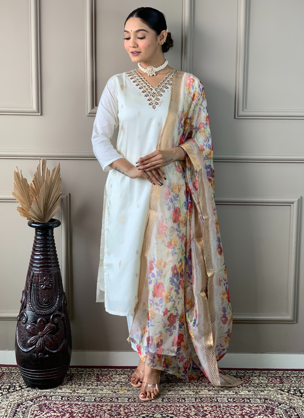 Introducing Nakshatra White Designer suit - a perfect blend of elegance and sophistication. Made with premium fabric in kamez, bottom, and dupatta, featuring intricate designer embroidery work. Ideal for office wear, this suit exudes luxury and style. Upgrade your wardrobe with this exclusive designer piece.