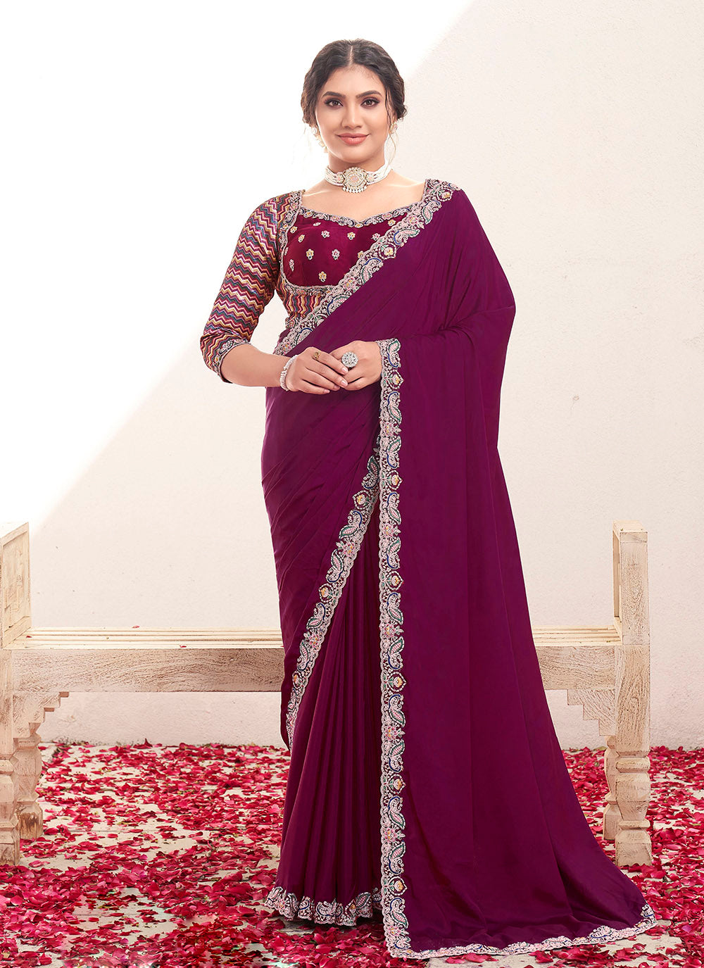 Turn heads at every celebration with this Designer Wine Saree crafted in luxurious Crepe Shimmer Silk. The saree glows with subtle shimmer and features exquisite sequence and heavy embroidery work, adding a rich and royal touch to your party look.