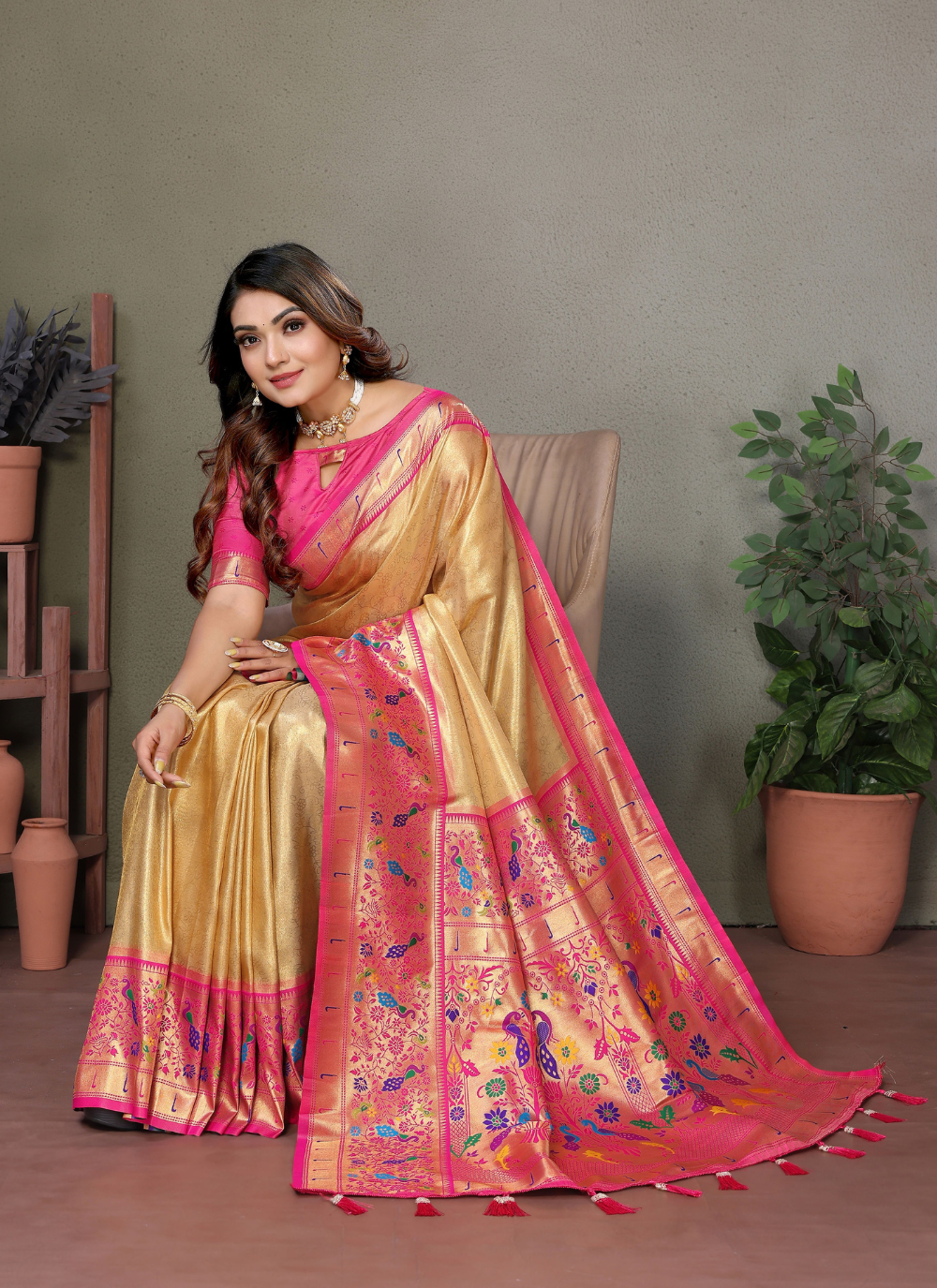 Be the center of attention at any celebration with this Nakshatra Yellow Banarasi Tissue Silk Saree. Its beautiful motifs, zari-woven traditional Paithani Border and Pallu, and handmade tassels exude elegance and refinement. Made from fine colored Banarasi Tissue Silk, this saree embodies Indian tradition and femininity. Elevate your ethnic wardrobe with this regal and ethereal creation. Note: Color may slightly be different from the actual item due