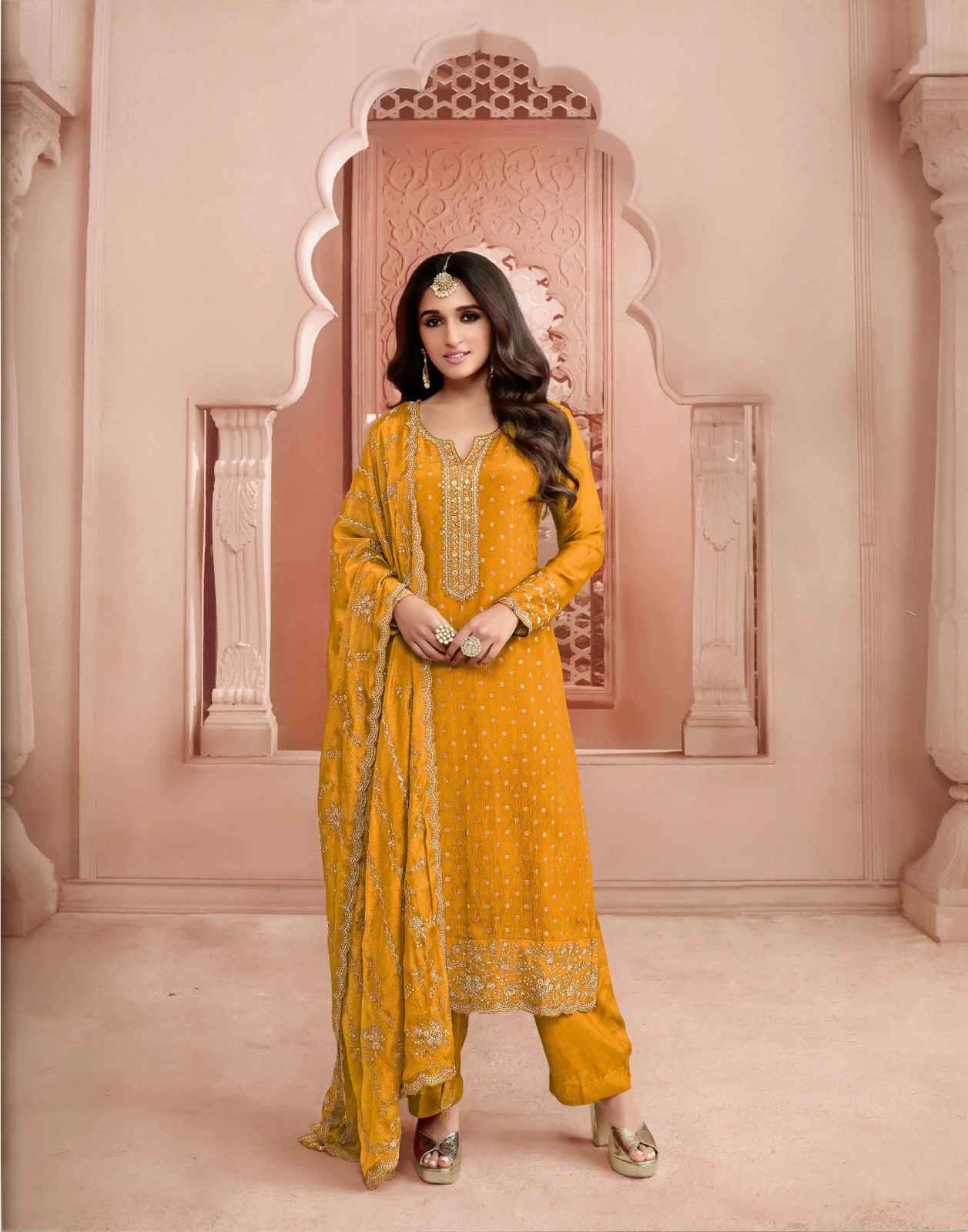 Celebrate the spirit of Teej in style with our Nakshatra Yellow Dola Silk Embroidered Suit! Featuring dazzling zari and sequin work on vibrant blue fabric, this suit effortlessly blends tradition with a playful twist. The heavy chinon embroidered dupatta adds a touch of elegance, making you the perfect diva for mehndi, Teej, or sangeet celebrations. Embrace the festive vibes and let your inner glow steal the show. Note: Color may slightly be different from the actual item due to photographic lighting sources or the monitor's settings.