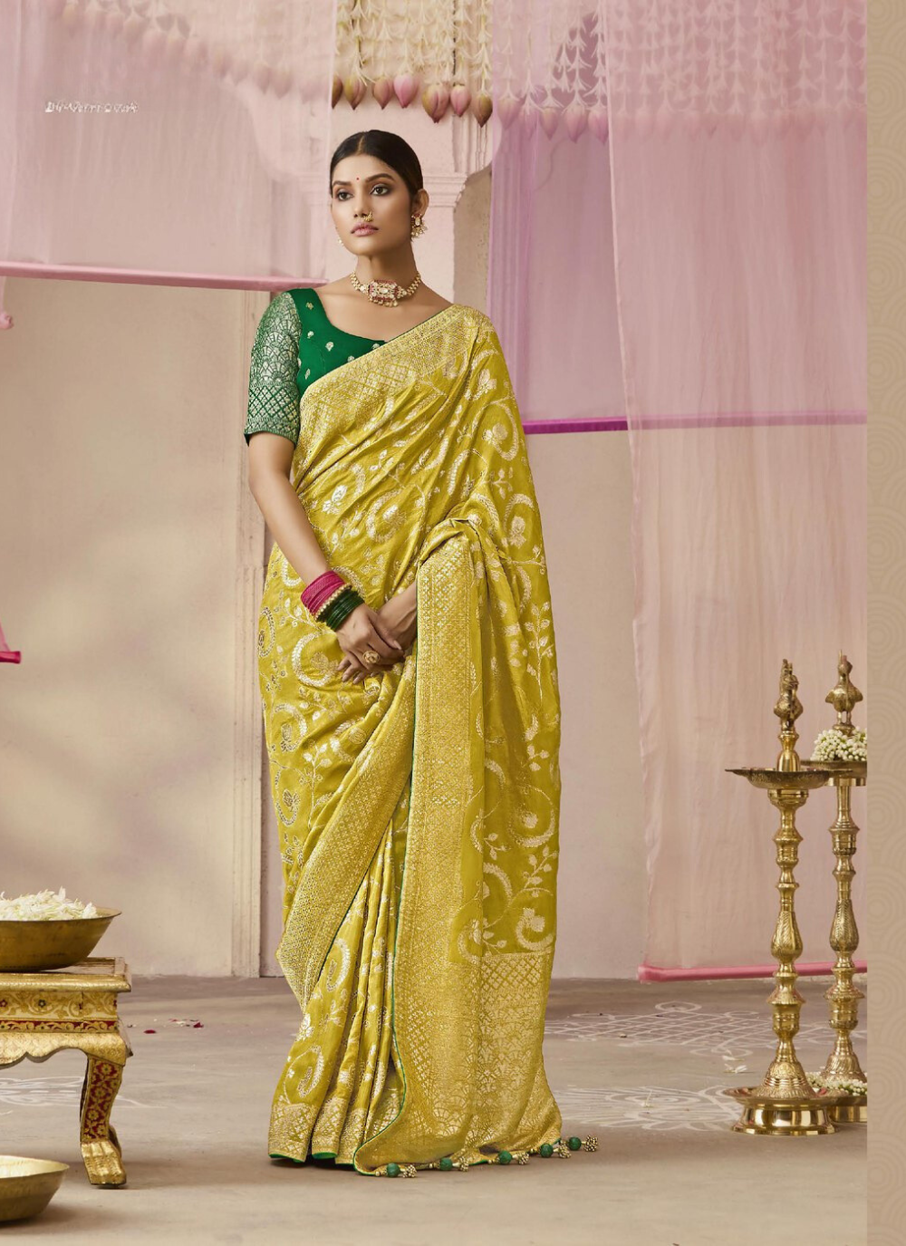Introducing the Nakshatra Yellow Dola Silk Saree! 🌼 Made of lustrous Dola viscose silk, this saree adds vintage grace to your wardrobe. With a beautiful flower weaving pattern, it's perfect for parties and festivals. Drape yourself in elegance and style.