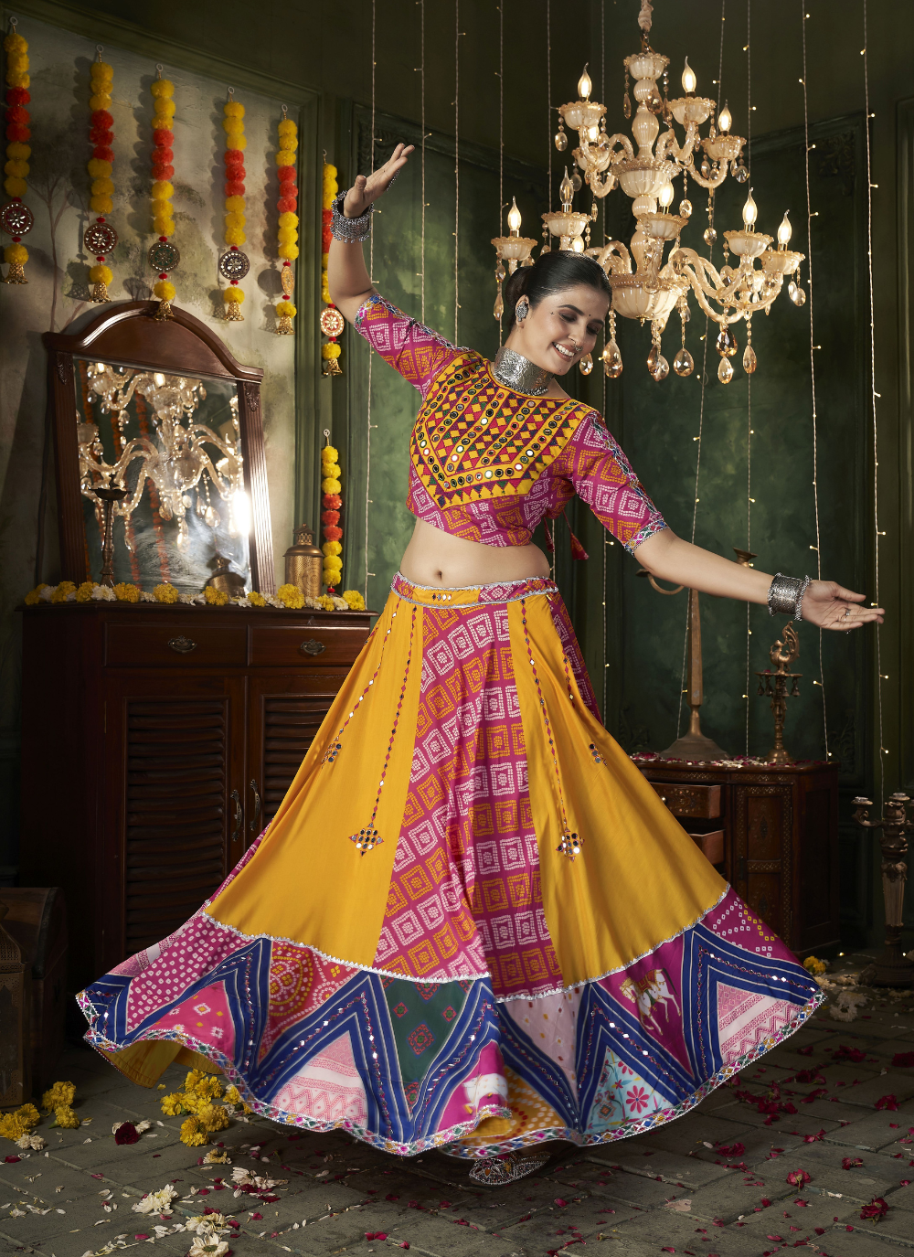 Get ready to turn heads with the Nakshatra Yellow Navratri Lehenga Choli. Made from comfortable muslin cotton fabric and fully stitched for a perfect fit, this stunning piece features intricate mirror work and heavy thread embroidery. The designer digital print adds a touch of uniqueness, making it perfect for Navratris and garba nights. Dare to stand out in this one-of-a-kind lehenga choli!
