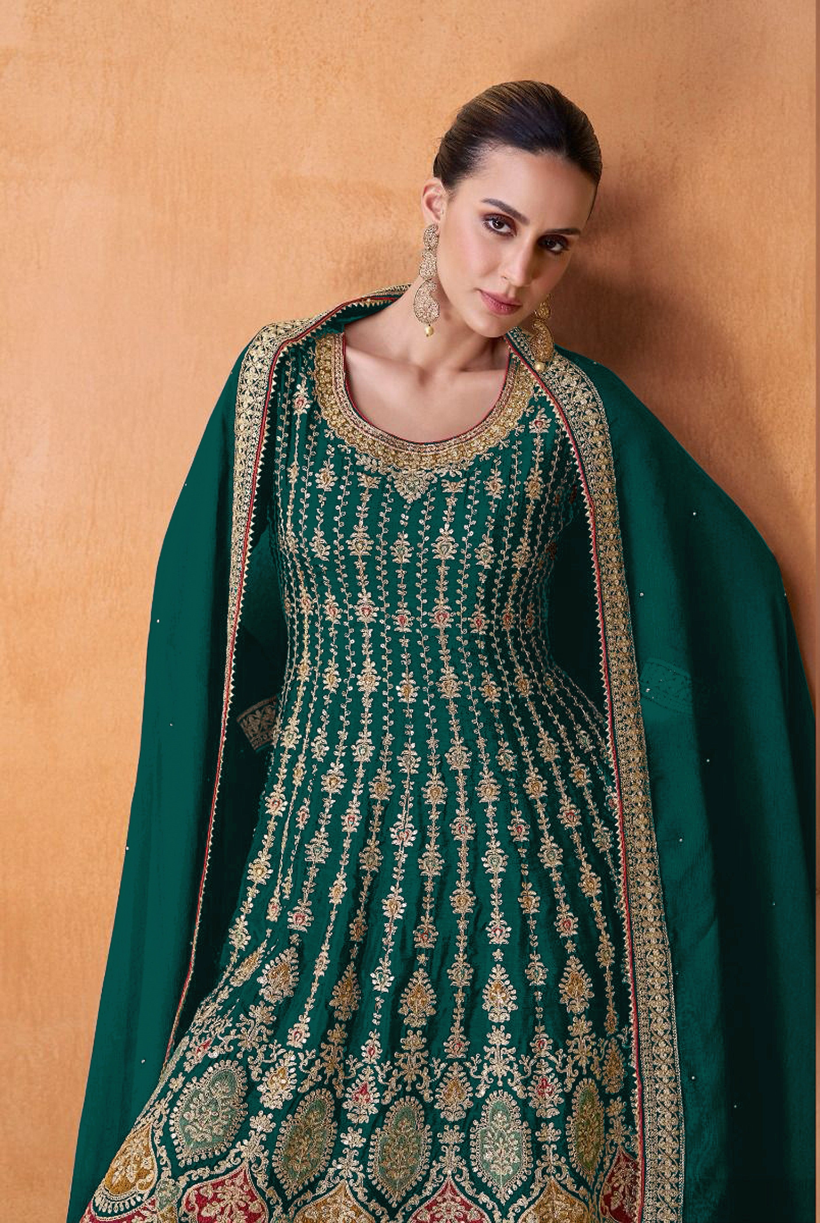 Express your unique sense of style with this premium Georgette palazzo suit set. The semi-stitched suits come with a stitched palazzo, made from high-quality Georgette fabric. The rich teal green color is perfect for any occasion. Take your fashion game to the next level with this stunning set. 🌟