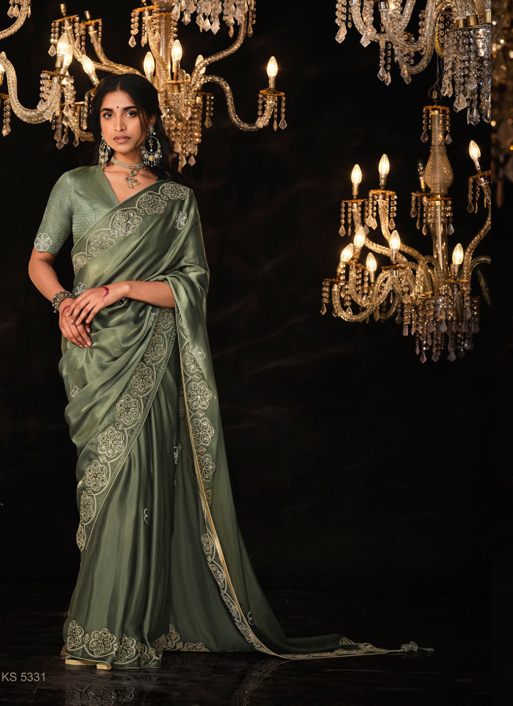 Introducing our Dusty Green Indian Saree for unapologetically bold fashionistas! With its intricate embroidery, glass tissue, brocade blouse, and shimmering accents of tassles, sequins, stones, and zarkan, this saree will make a statement at any special event. Elevate your style and turn heads with this stunning piece!