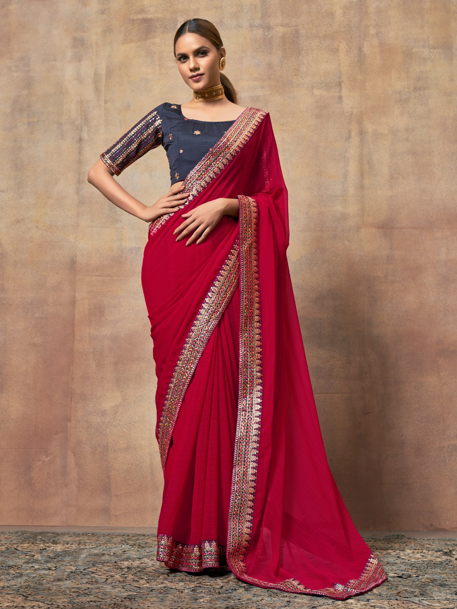 Get ready to turn heads in our playful red chiffon saree. With its beautiful lace border and contrast embroidery blouse, this casual style will make you stand out. Perfect for any occasion, this saree is the definition of quirky fun!