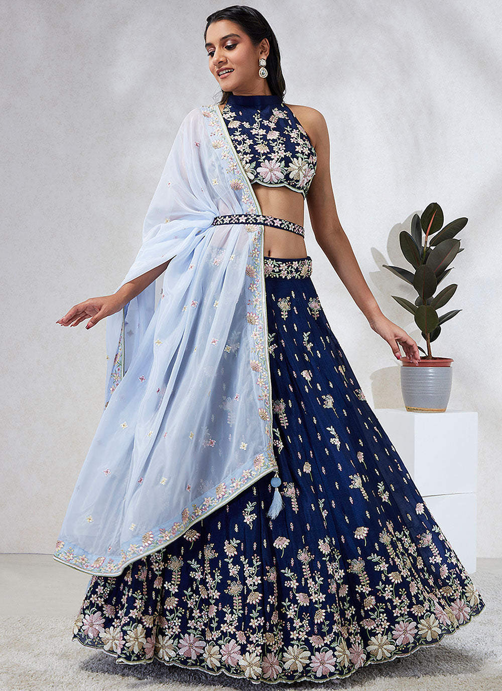 Get ready to make a splash at any event in the Regal Neptune Ensemble! The Nevu Blue & Sky Blue colors pop on the Georgette fabric, accented with stunning Thread & Sequin embroidery. This partywear set is crafted with attention to detail and will surely turn heads. Buy now and shine!