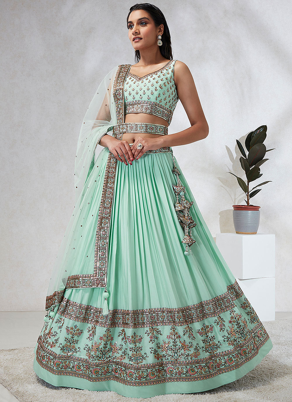 Experience the calming allure of our Sapphire Serenity Set ๐ Made with delicate sea green georgette and net fabric, with stunning thread and sequin embroidery ๐งต Perfect for any occasion, this set will give you an attractive and unique look in just 7 days โฐ Don't miss out on this fine and heavy designer choli, lehenga, and dupatta combo! ๐ Pair with some sparkling sea green jewelry for the ultimate look ๐ฅ Buy now and stand out in style! โจ