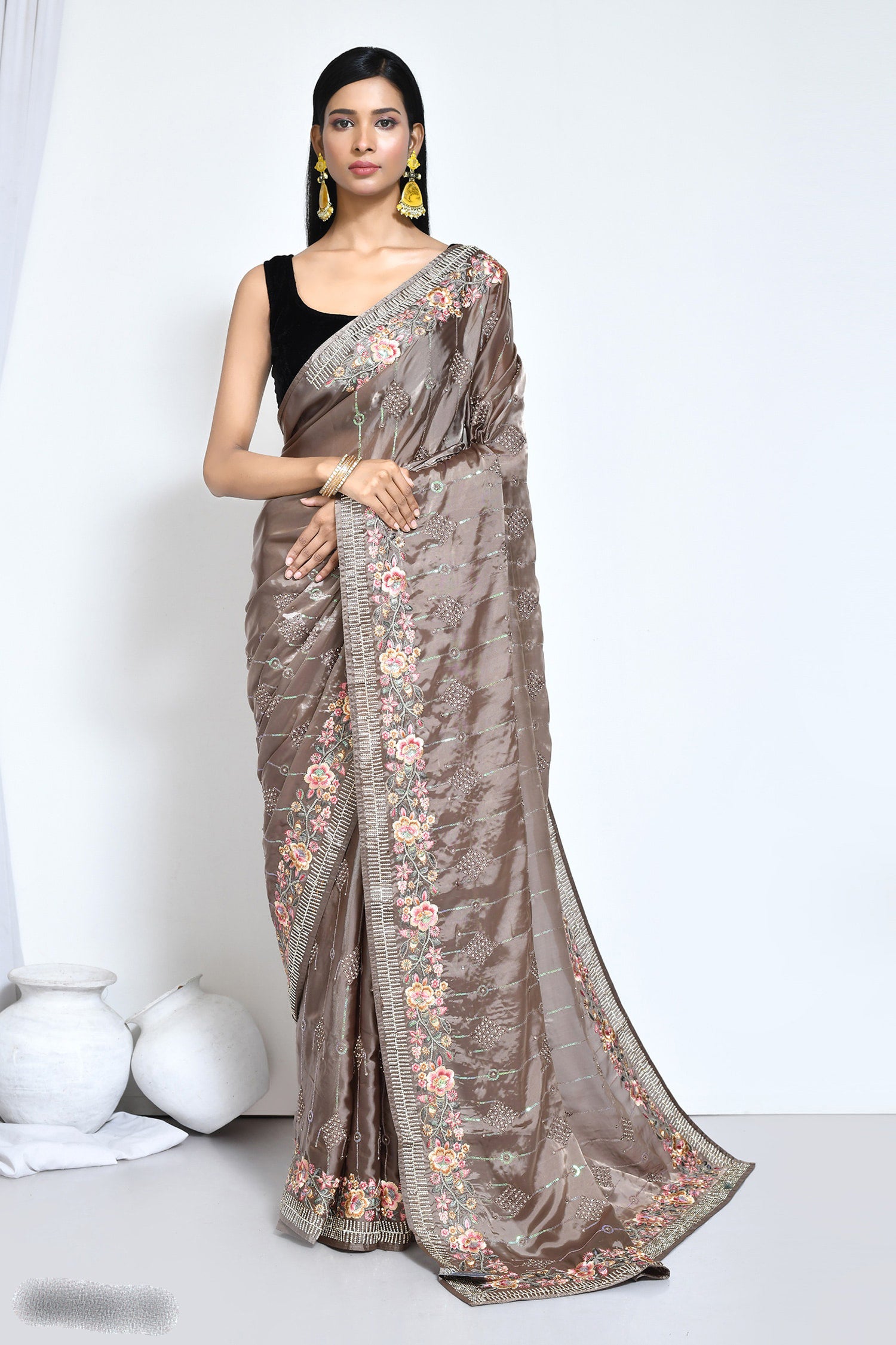 Get ready to turn heads with our Brown satin silk saree. With its brown hue and intricate heavy sequence embroidery and stone Work, this designer saree is perfect for parties and special occasions. You'll feel elegant and stylish in this one-of-a-kind piece.